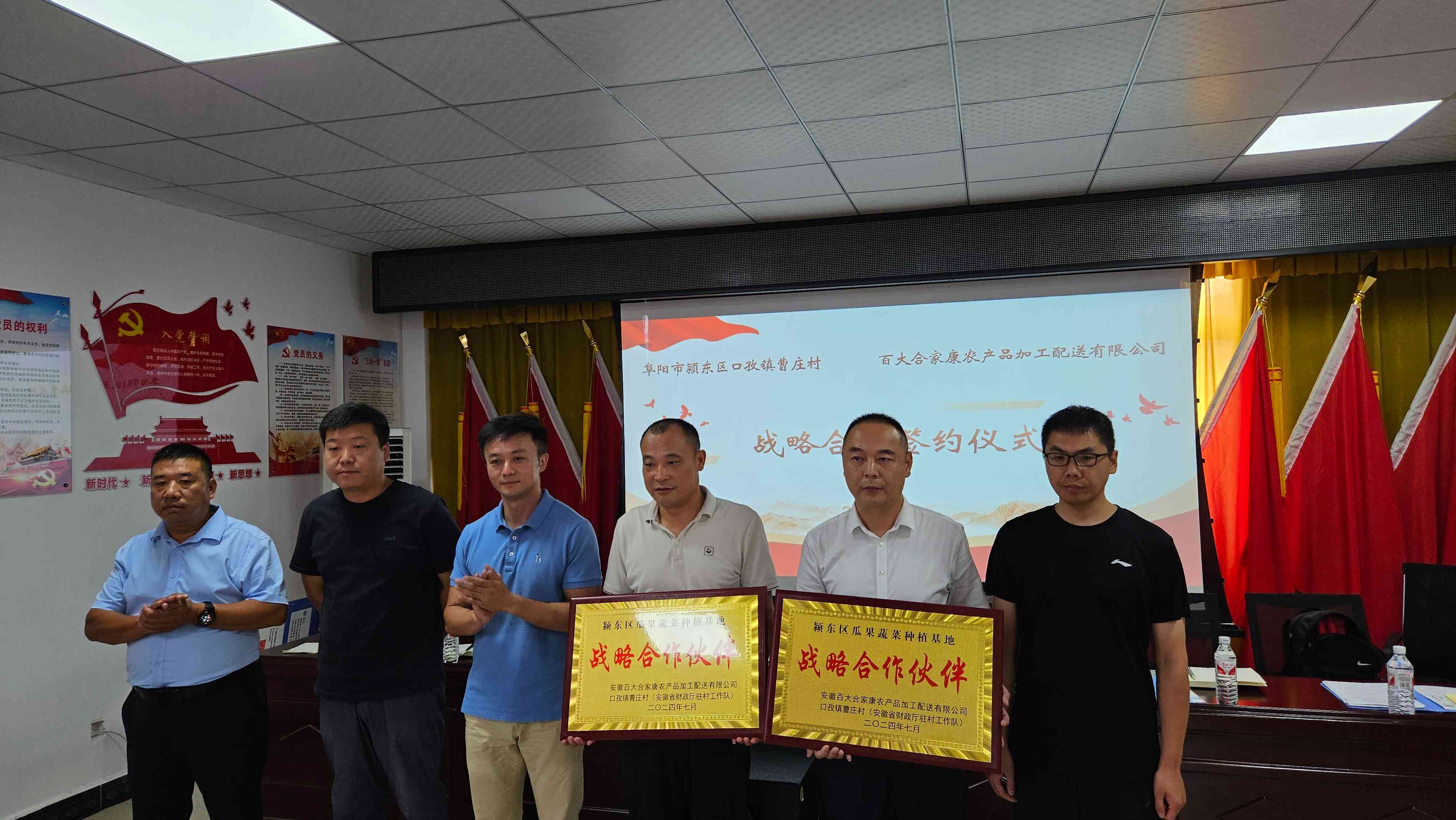 2024年9月6日,百大合家康与阜阳市颍东区口孜镇曹庄村举行订单种植采购项目战略合作签约仪式。百大合家康副经理沈力、口孜镇曹庄村省财政厅驻村第一书记汪昀、村