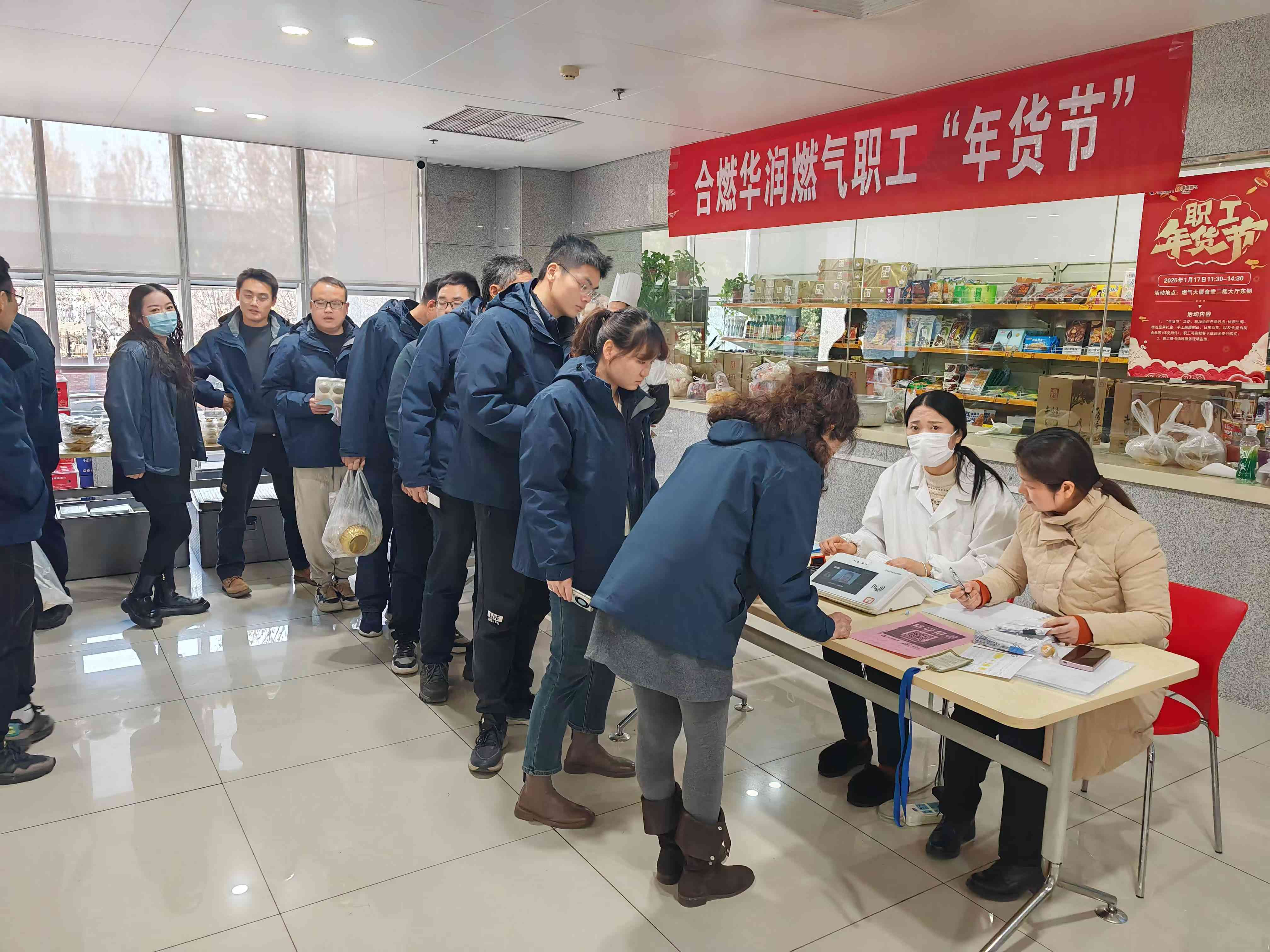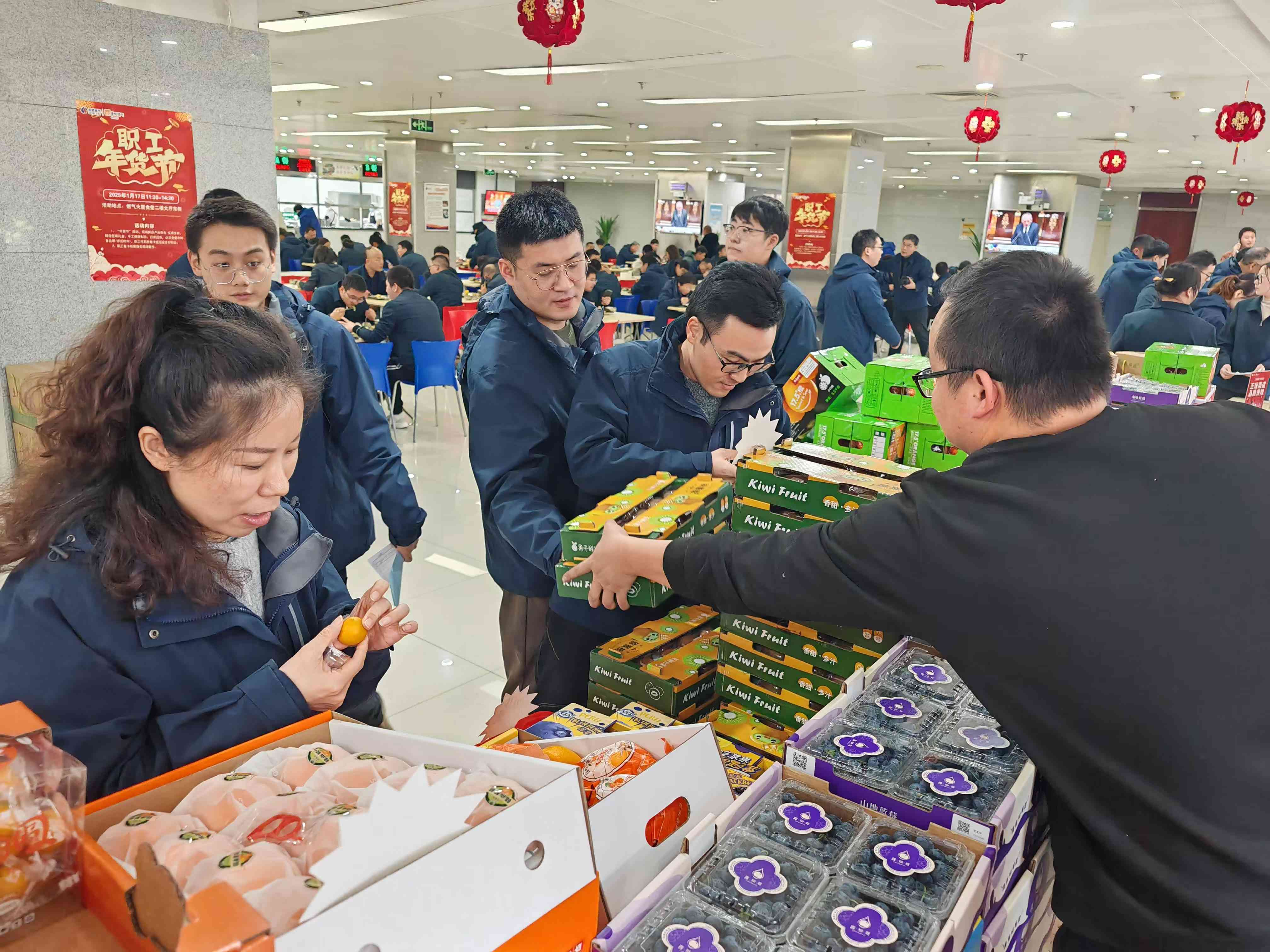 交易区前,职工朋友们排起了整齐有序的队伍。大家一边耐心等待结账,一边与身旁的同事分享着购物的喜悦,交流着各自的“战利品”。食堂里,温馨与欢乐相互交融,处处都弥漫着浓厚的节日气息。