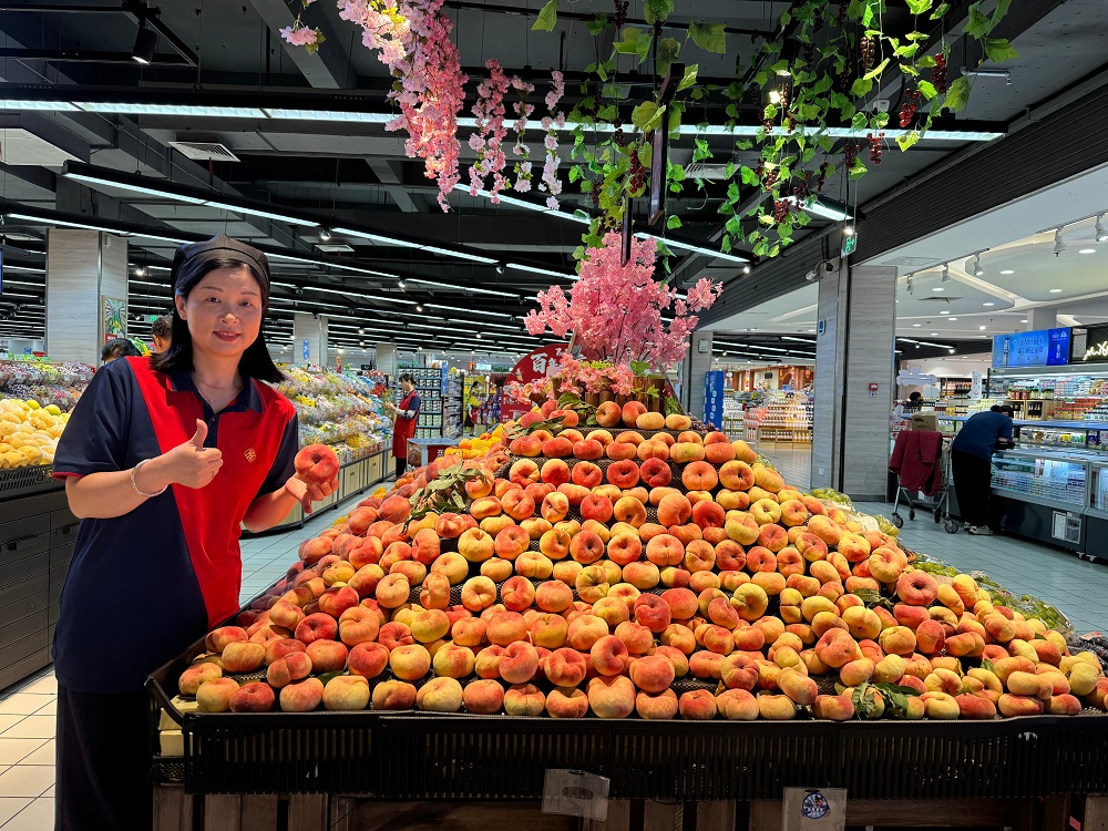 百大合家福门店首批铺货的4000斤蟠桃也受到了消费者的热烈追捧。马鞍山路购物广场店的400斤、舒城路800斤的蟠桃上架数小时内便被抢购一空。与此同时,当晚,由闸山村党组织领办合作社创建的“书记四人寻”直播间,开播两小时即达成2000斤线上订单。据估算,今夏蟠桃总销量将突破5万斤,直接带动种植户创收20万元。