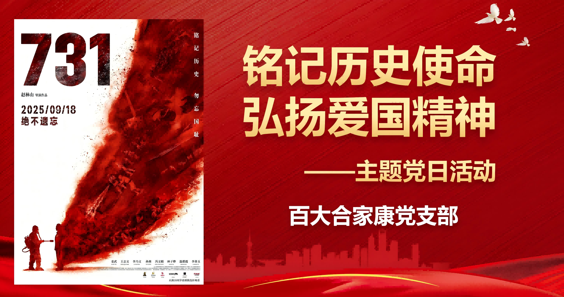 2025-09-26 为进一步增强民族责任感与历史使命感,从历史中汲取奋进力量,百大合家康党支部开展“铭记历史·践行使命”主题党日活动,分批组织公司全体员工观看爱国题材影片《731》。
