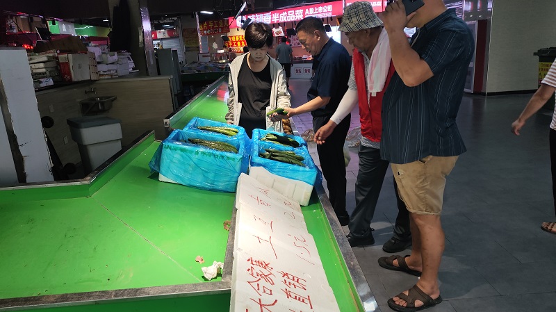2023-08-228月17日,由合家康助农直采的新鲜蔬菜首次进入合家悦瑶海佳苑农贸市场现场惠民售卖。