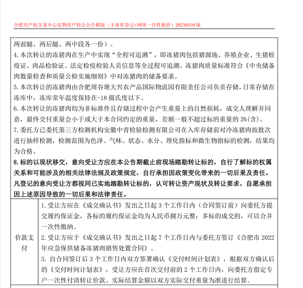 该项目详细情况可访问“全国公共资源交易平台(安徽省·合肥市)“官网,搜索“合肥市2022年应急保供储备冻猪肉销售处置”,了解详细竞价流程并参与竞价。或点击下面文字跳转链接