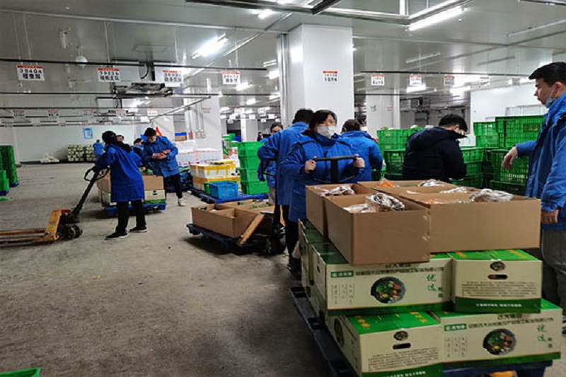 2021-02-08盒装鲜菜包装是合家康公司春节团购的重点工作之一,盒装鲜菜的包装速度已经跟不上需求的进度,党支部得到消息后立即研究决定,成立节前党员突击队,2月7日下午2点半,全体党员去现场支援盒装鲜菜包装。