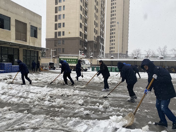雪虽大,但大家的热情不减。有的负责用铁锹破冰,有的用扫帚清扫积雪,有的负责搬运,有的负责撒盐,充分发扬团结奋进、互助合作的良好团队精神,经过不到一个小时的时间,终于将公司路面及路口处积雪全部清除。