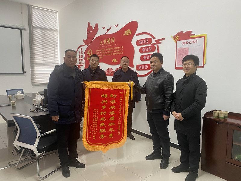 2023-02-20“我代表颍东区的村民感谢你们!”2月17日下午,颍东区口孜镇曹庄村第一书记朱乐磊、正午镇吴寨居第一书记黄贤达将一面印有“振兴乡村为民服务,助农扶贫履职尽责”的锦旗送至百大合家康,真诚感谢合家康公司助力颍东区农产品销售,带动群众增收。